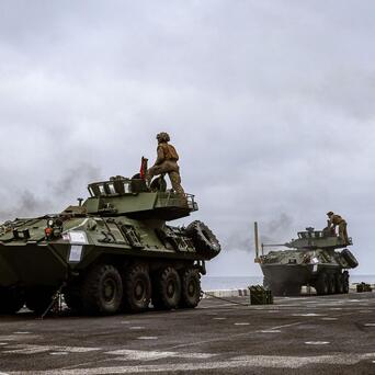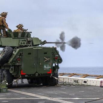 【美国海军陆战队搞了个很抽象的训练】他们将几辆LAV-25步兵战车开到了圣安东尼奥级船坞登陆舰的甲板上,然后进行对海射击,美名其曰加强舰艇防御能力。